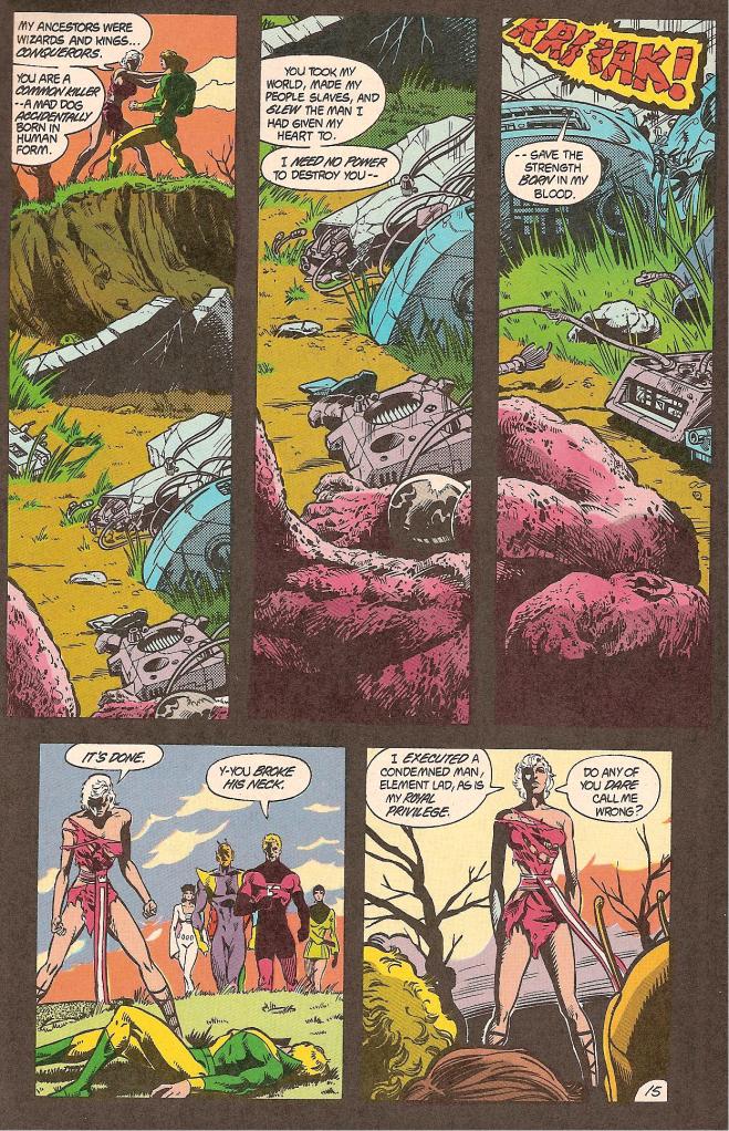 Threeboot: At the start of the series, Jeckie was a spoiled rich girl who bought her way into the Legion. She didn’t have any powers and Cosmic Boy was stringing her along so she’d continue to bankroll the team. Then Orando was destroyed, she became more determined, and inherited some superpowers. That was fine until Jim Shooter took over as writer and decided that she’d been kind of unhinged by what happened to Orando, and started to turn her into a villain. We never did see how that played out, and now it looks like we probably never will.